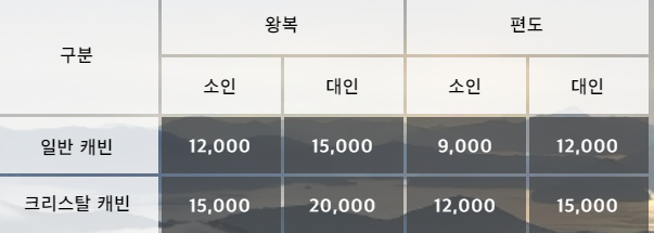 크리스탈 캐빈의 경우 왕복 요금은 대인 20000원, 소인 15000원이고, 편도는 대인 15000원, 소인 12000원입니다.