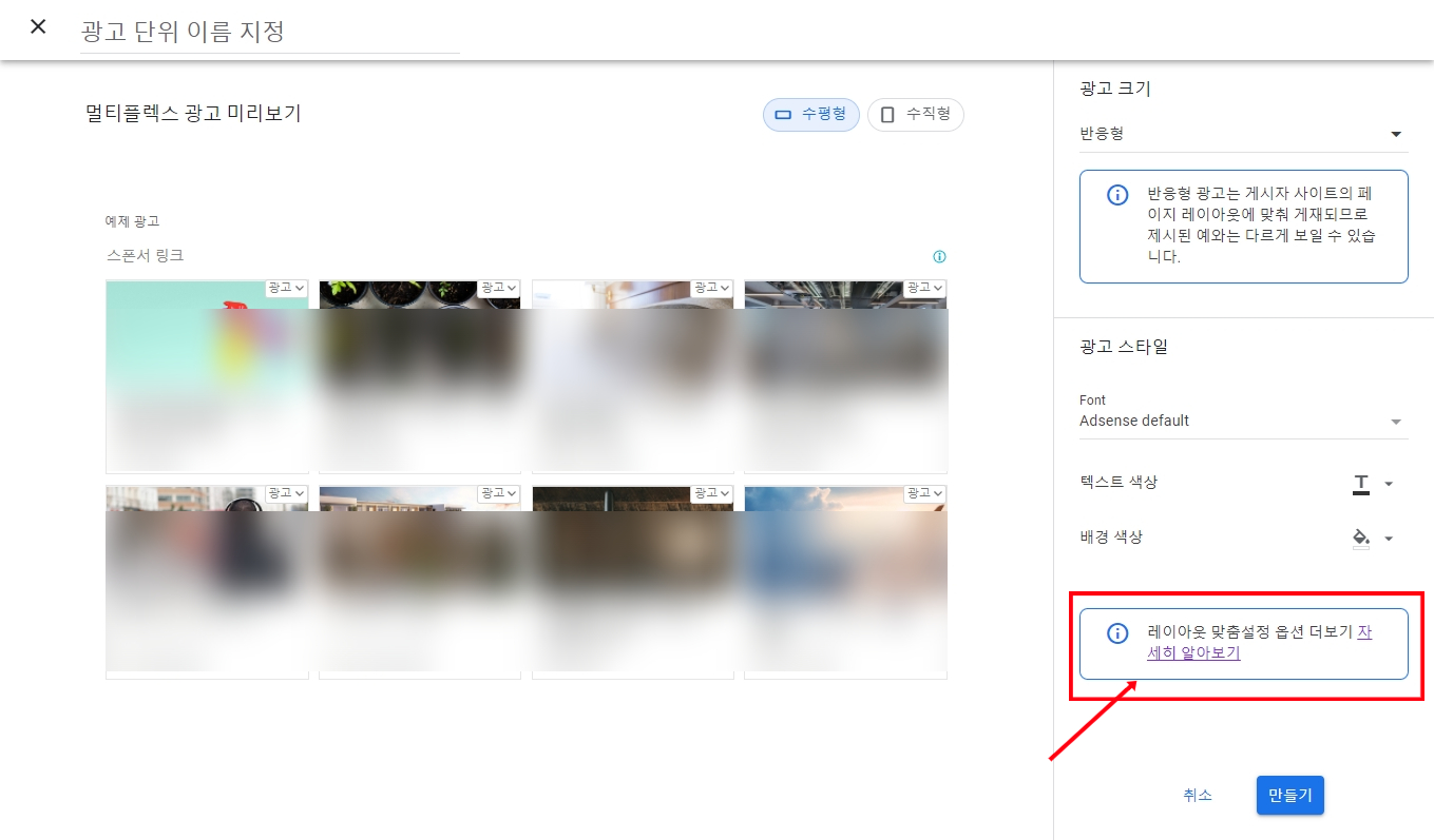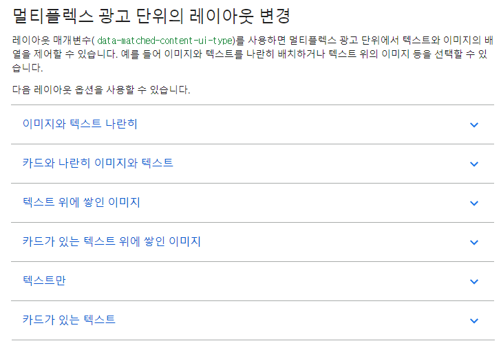 우리는 뭔가 새로운 것을 할 때는 구글의 매뉴얼을 잘 볼 필요가 있습니다. 우측 하단을 보면 '레이아웃 맞춤설정 옵션 더 보기'라고 적혀 있는 것이 있습니다. 구글에서 레이아웃 변경에 대해 아주 잘 설명해 놓은 것이죠. 이것을 눌러보는 사람이 적은지, 거의 대부분의 애드센스 유저들은 기본 형태로 멀티플렉스 광고를 쓰더군요.